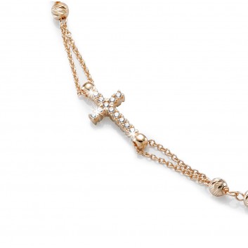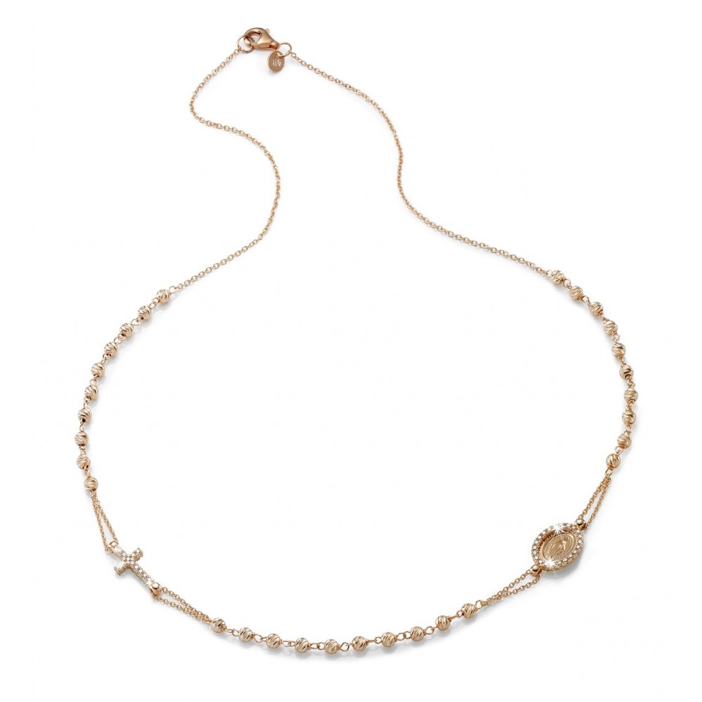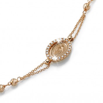 18 Kt rose gold rosary necklace with diamonted beads, Miraculous Madonna with cubic zirconia setting and pave cubic zirconia in both sides of the cross