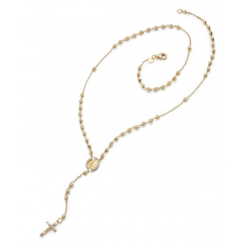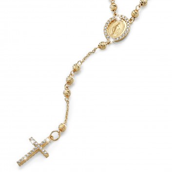 18 Kt yellow gold rosary necklace with diamonted beads, Miraculous Madonna with cubic zirconia setting and pave cubic zirconia in both sides of the cross