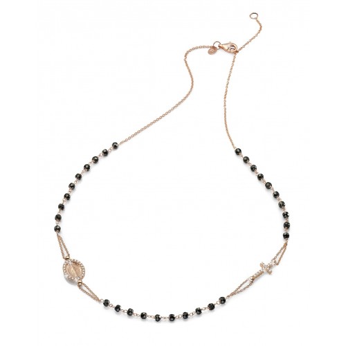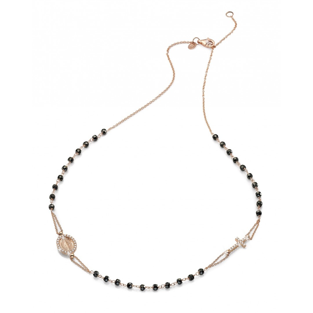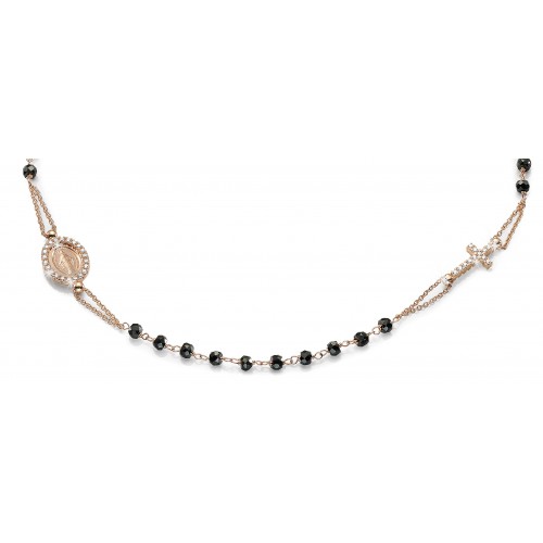 18 Kt rose gold rosary necklace with faceted onyx beads, Miraculous Madonna with cubic zirconia setting and pave cubic zirconia in both sides of the cross