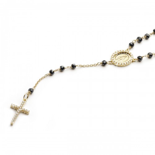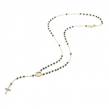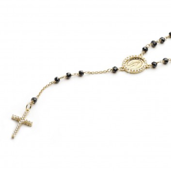 18 Kt yellow gold rosary necklace with faceted onyx beads, Miraculous Madonna with cubic zirconia setting and pave cubic zirconia in both sides of the cross