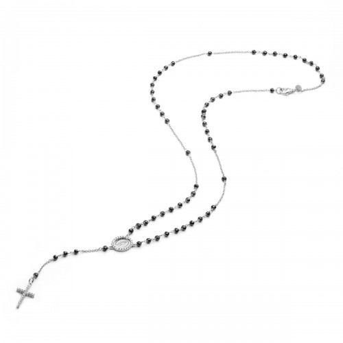 18 Kt white gold rosary necklace with faceted onyx beads, Miraculous Madonna with cubic zirconia setting and pave cubic zirconia in both sides of the cross