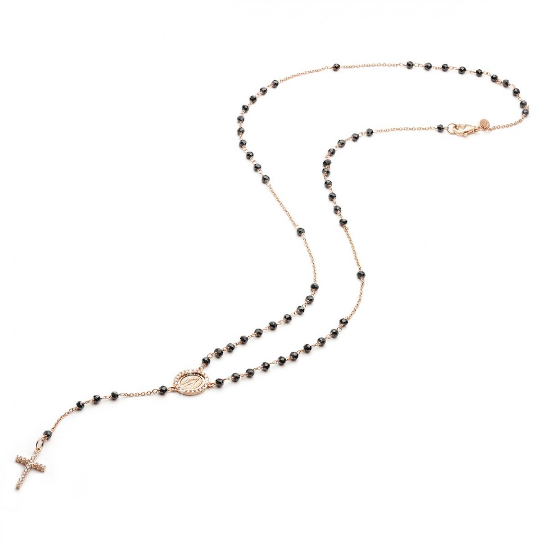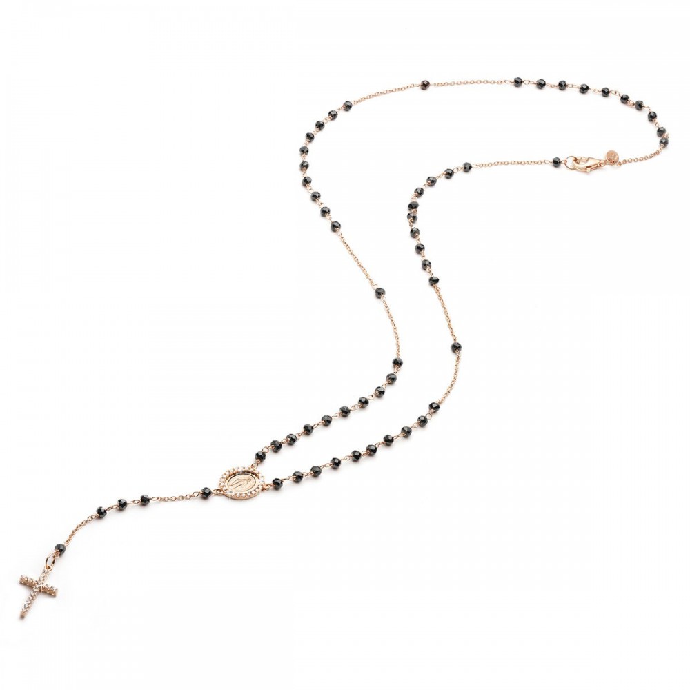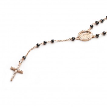 18 Kt rose gold rosary necklace with faceted onyx beads, Miraculous Madonna with cubic zirconia setting and pave cubic zirconia in both sides of the cross