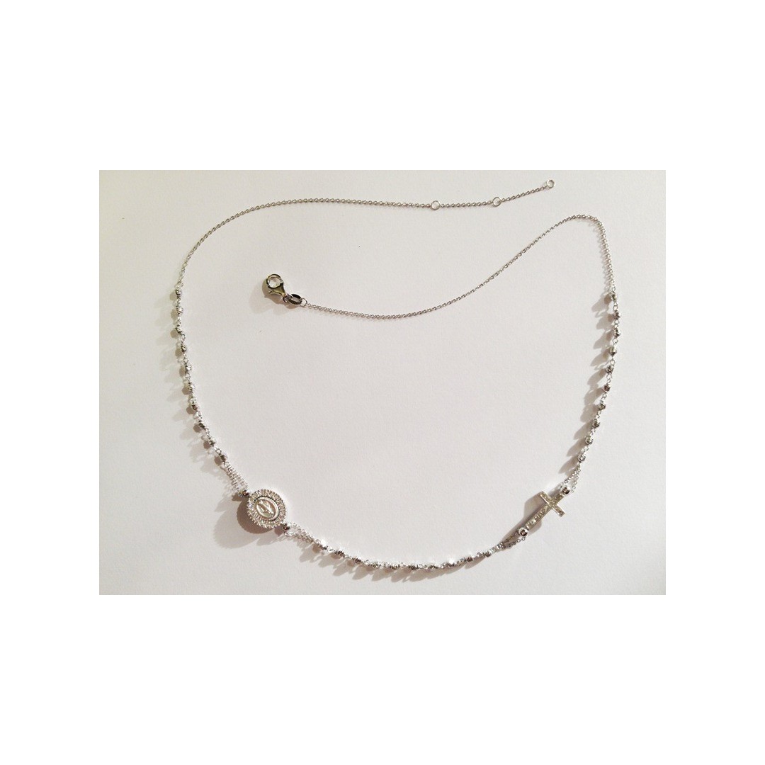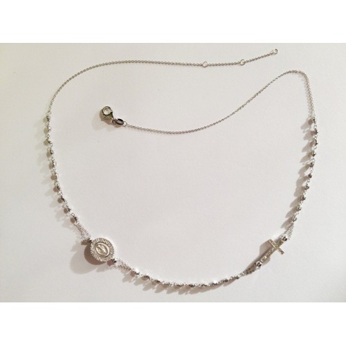 18 Kt white gold necklace with diamonted beads, Miraculous Madonna with cubic zirconia setting and pave cubic zirconia cross