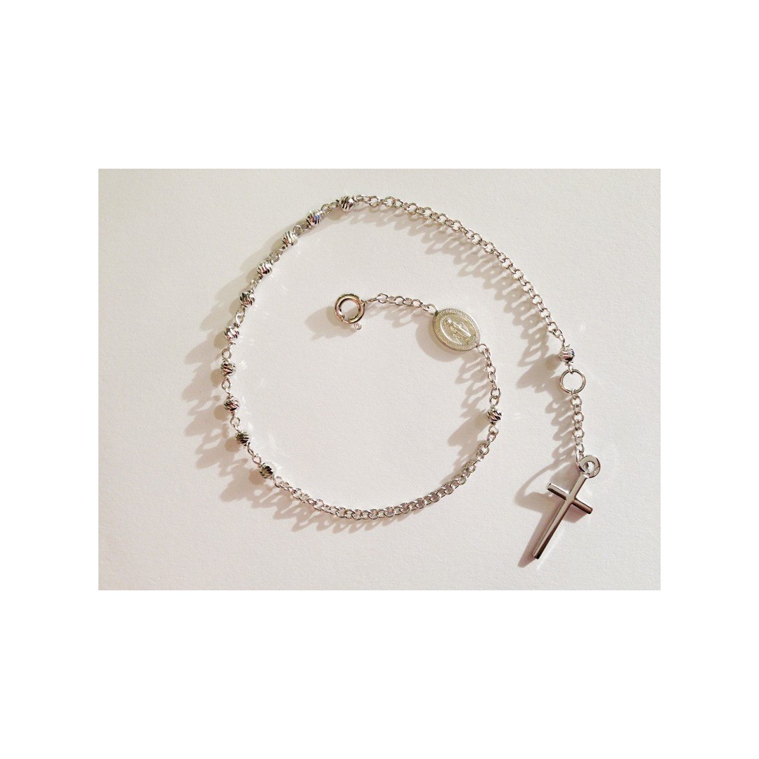 18 Kt white gold ROSARY bracelet with diamonted beads, Miraculous Madonna and plain cross