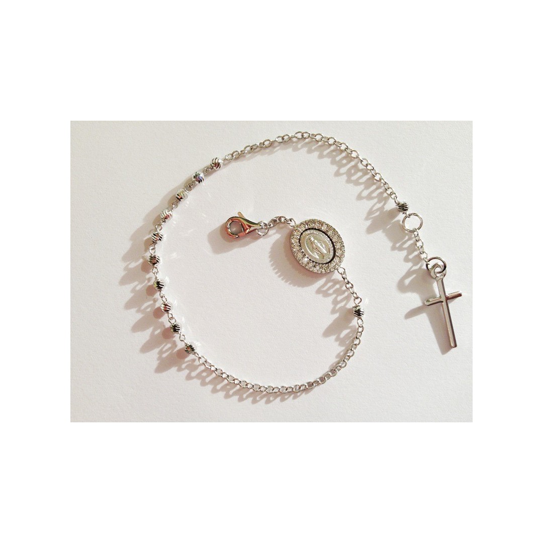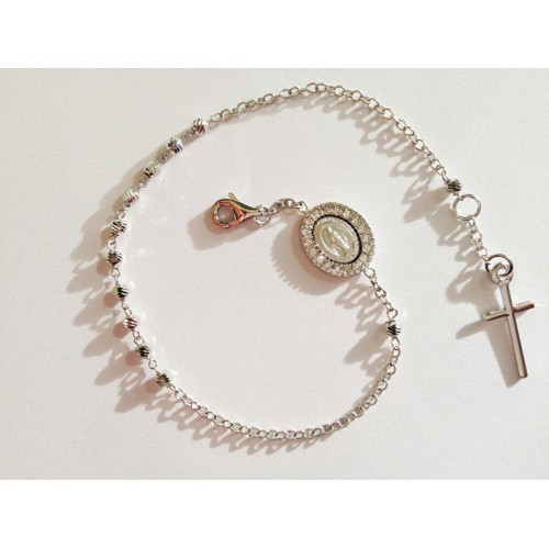 18 Kt white gold ROSARY bracelet with diamonted beads, Miraculous Madonna with cubic zirconia setting and plain cross