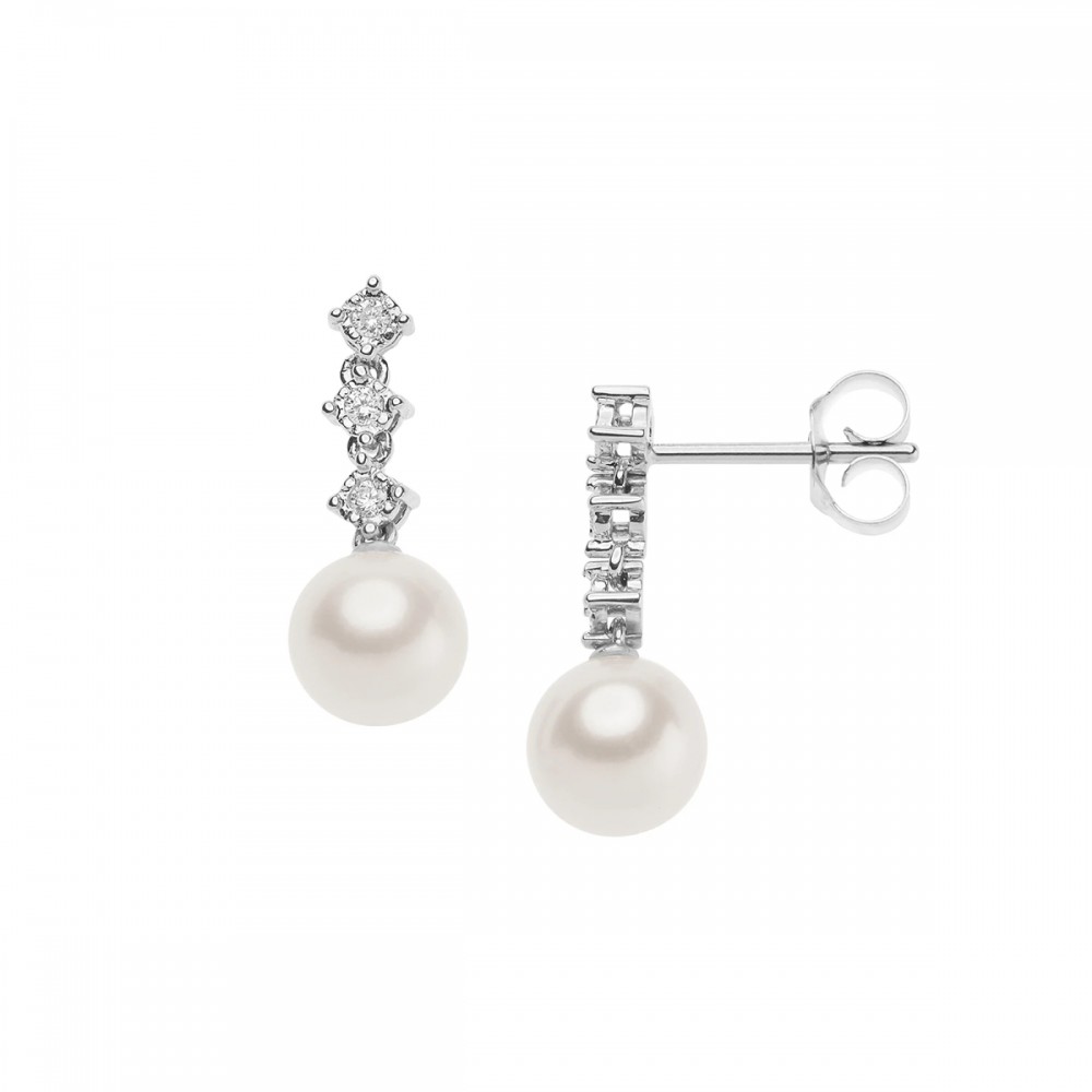 Comete earrings in 18kt white gold with cultured pearls and diamonds.