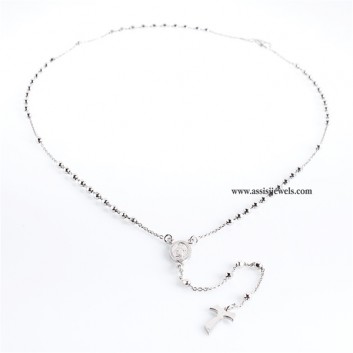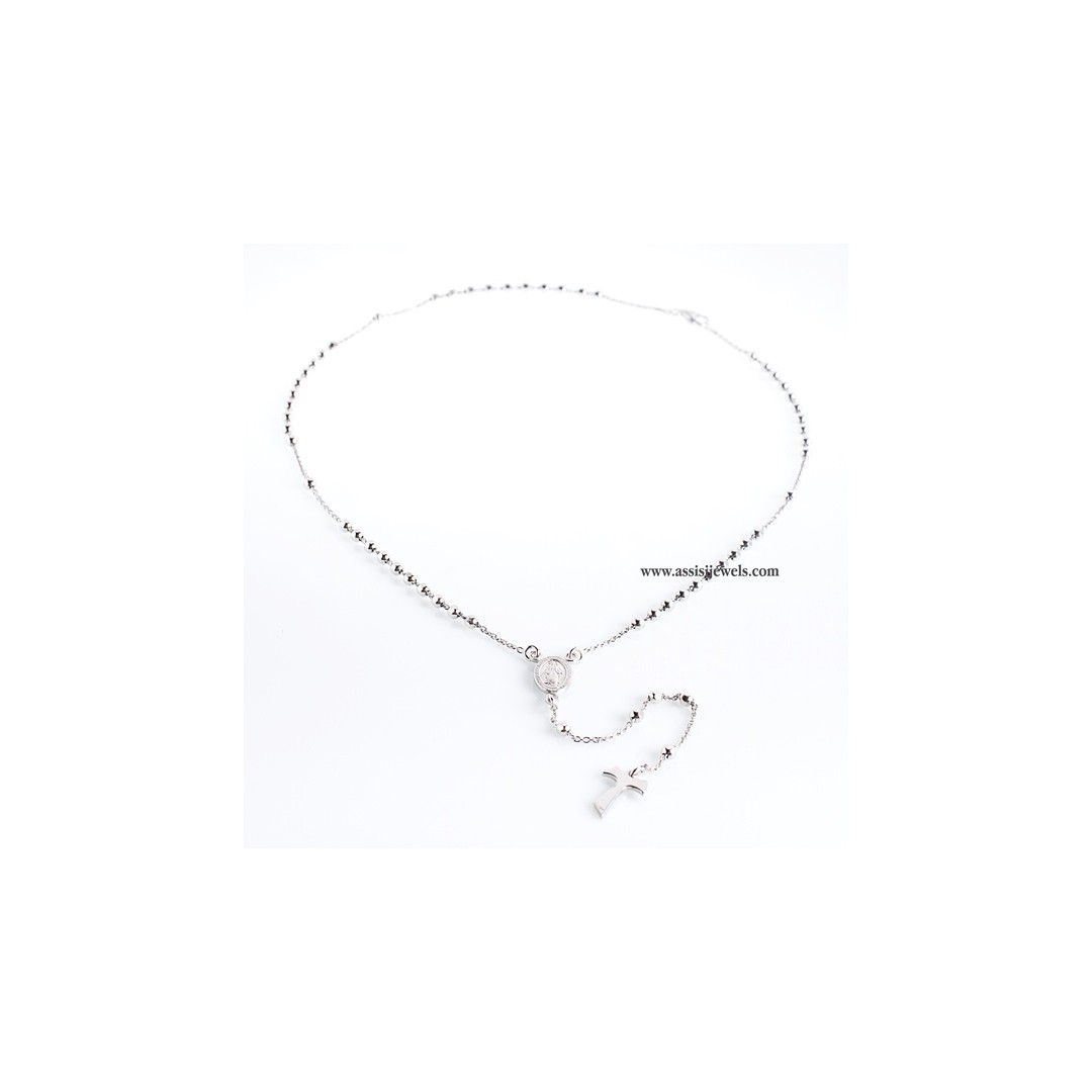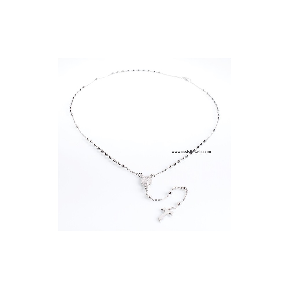 Rhodium plated 925 sterling silver ROSARY necklace with faceted beads, Miraculous Madonna medal and plain Tau cross