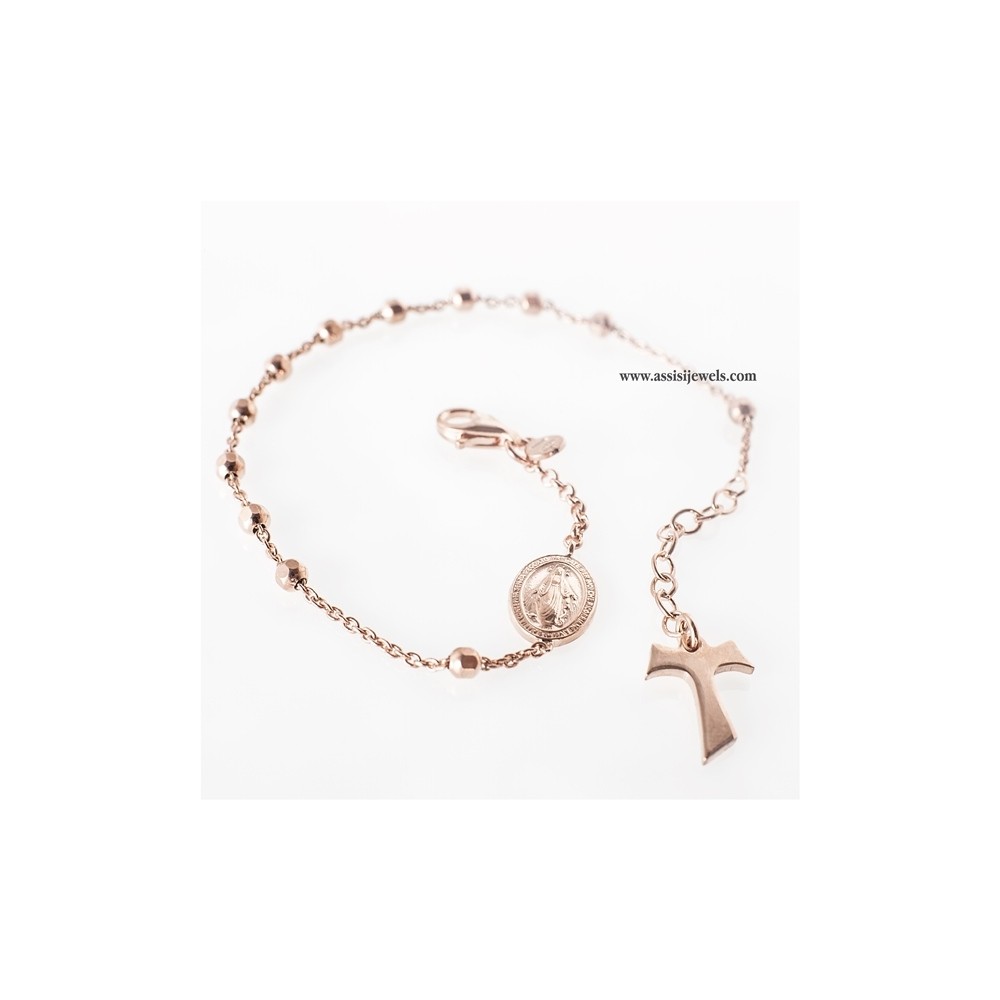 22 Kt rose gold plated 925 sterling silver ROSARY bracelet with faceted beads, Miraculous Madonna medal and plain Tau cross
