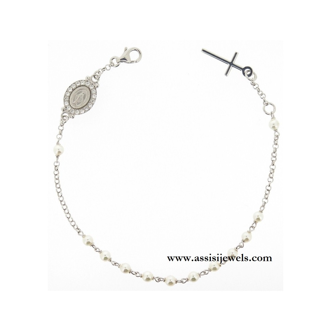 Rhodium plated 925 sterling silver ROSARY bracelet with cultured pearls beads, Miraculous Madonna with cubic zirconia setting and plain cross