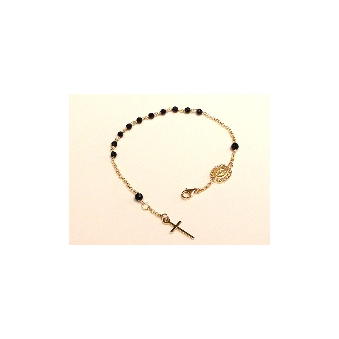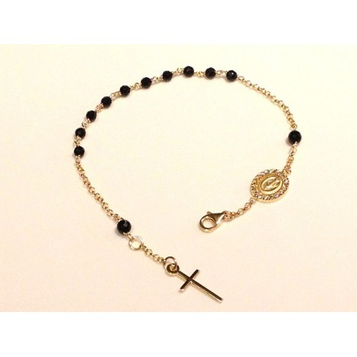 24 Kt yellow gold plated 925 sterling silver ROSARY bracelet with faceted onix beads, Miraculous Madonna with cubic zirconia setting and plain cross