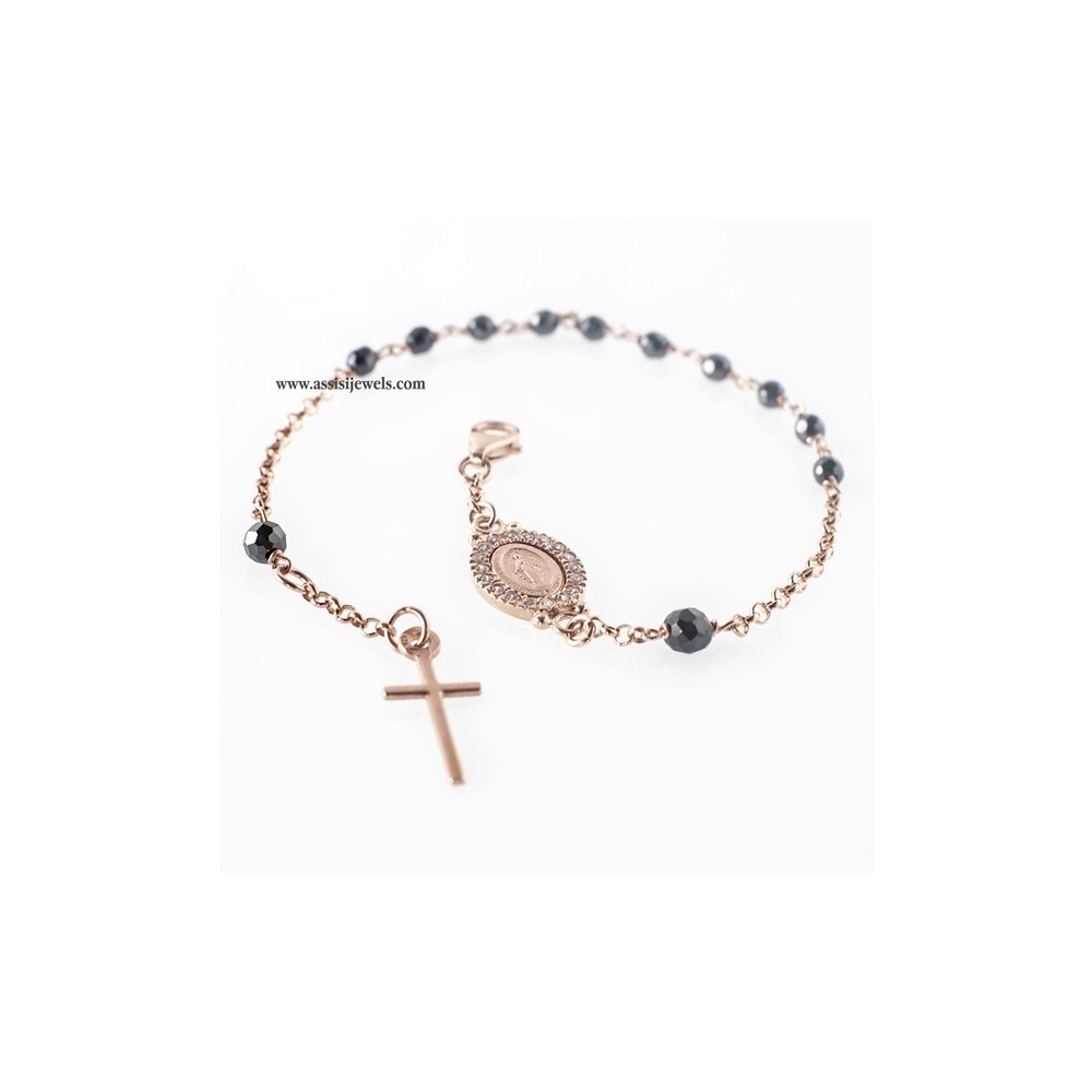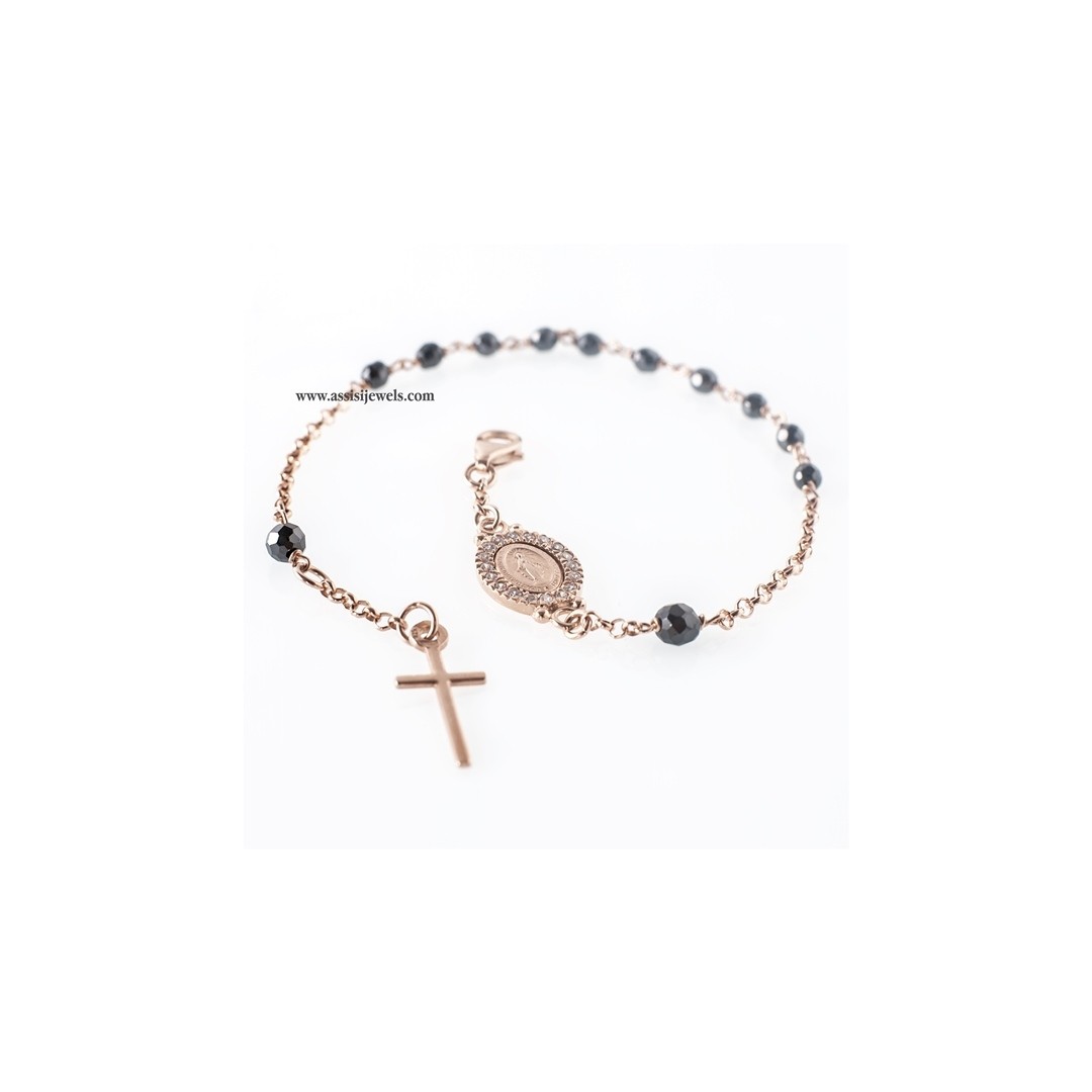 22 Kt rose gold plated 925 sterling silver ROSARY bracelet with faceted onix beads, Miraculous Madonna with cubic zirconia setting and plain cross