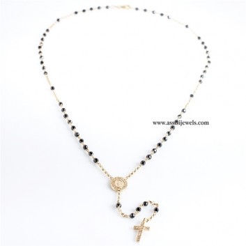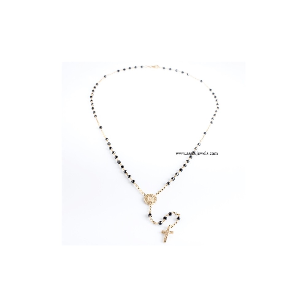 24 Kt yellow gold plated 925 sterling silver ROSARY necklace with faceted onix beads, Miraculous Madonna with cubic zirconia setting and pave cubic zirconia cross