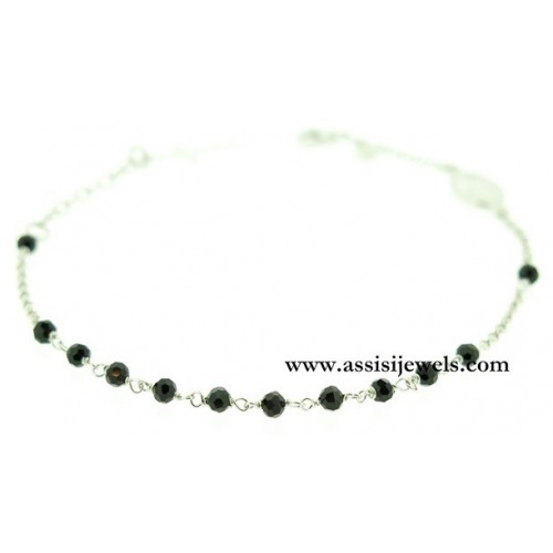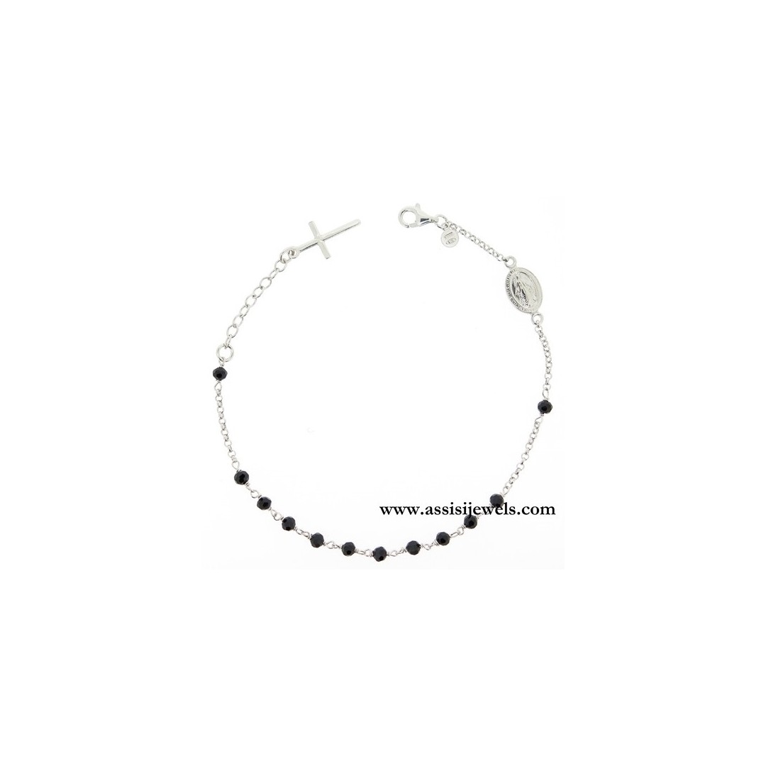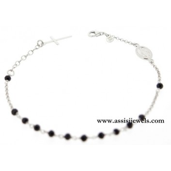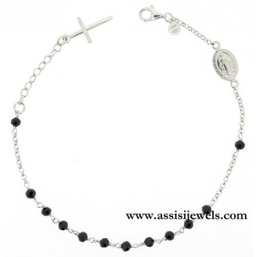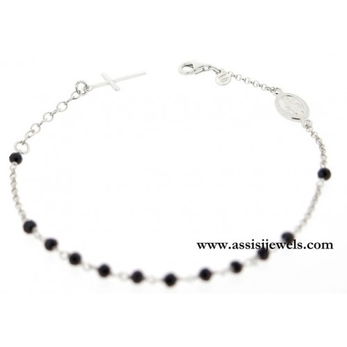 Rhodium plated 925 sterling silver ROSARY bracelet with faceted onix beads, Miraculous Madonna medal and plain cross