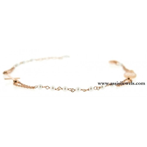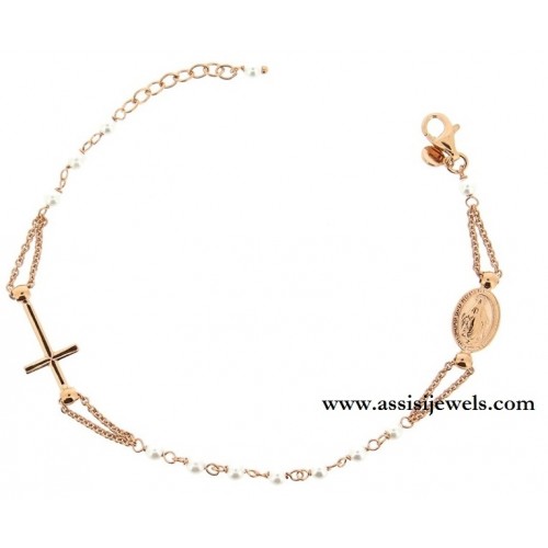 22 Kt rose gold 925 sterling silver ROSARY bracelet with pearl beads, Miraculous Madonna medal and plain cross