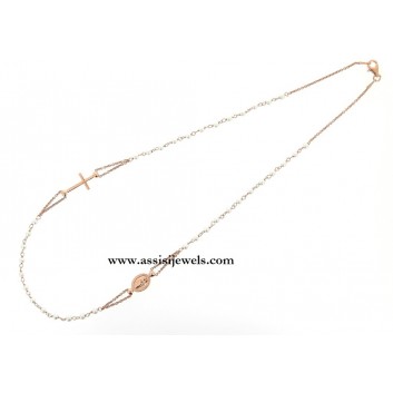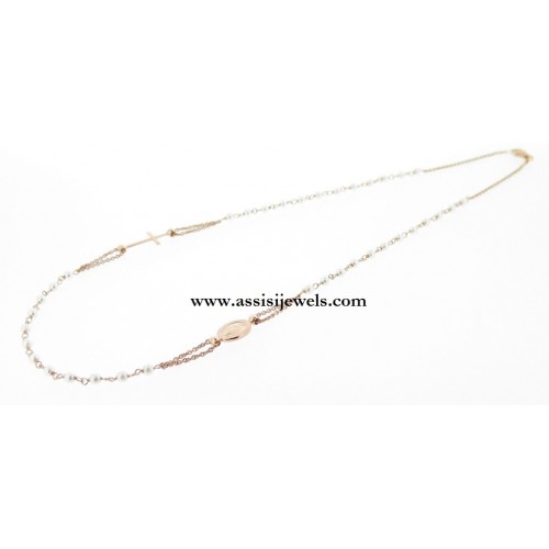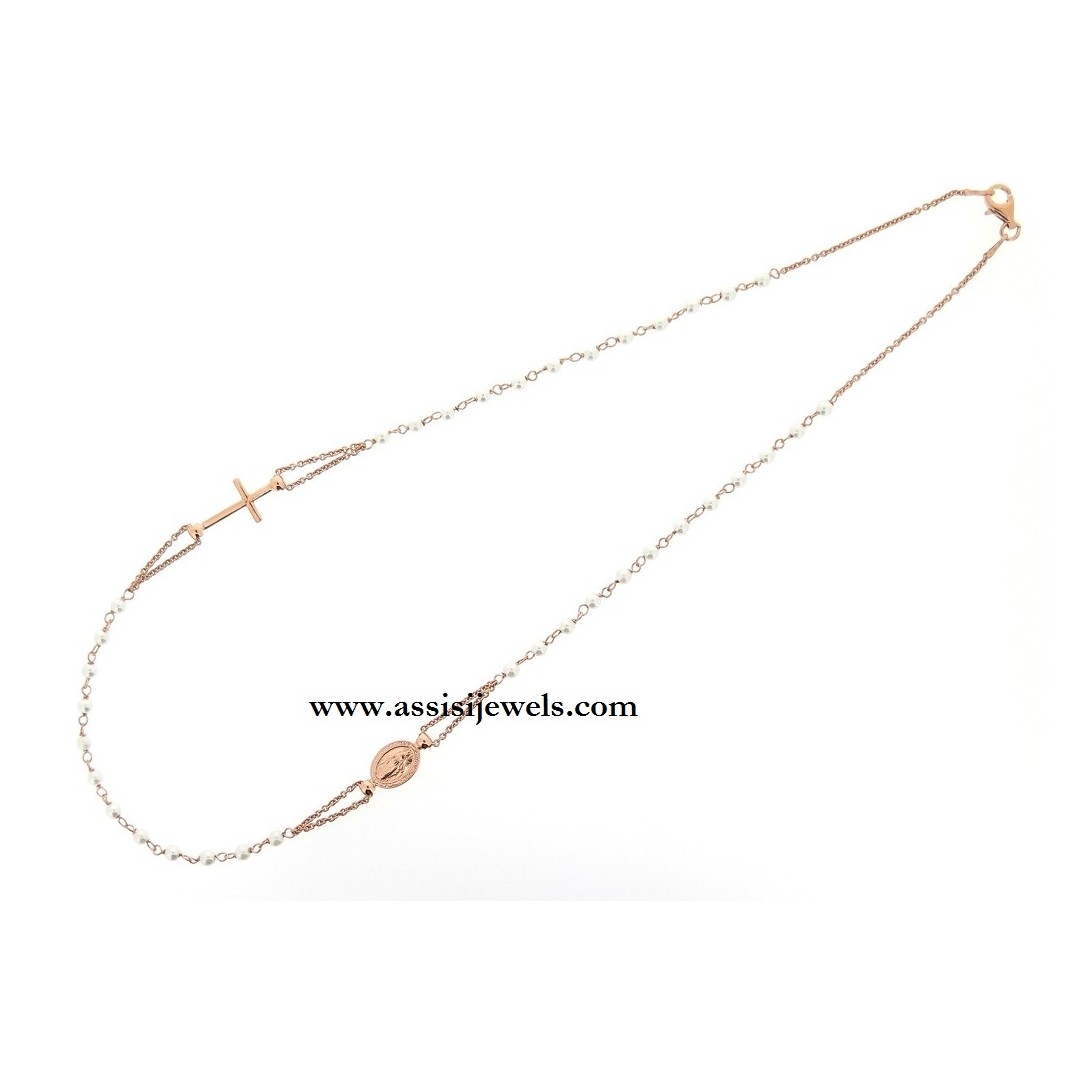 22 Kt rose gold 925 sterling silver ROSARY bracelet with faceted pearl beads, Miraculous Madonna medal and plain cross