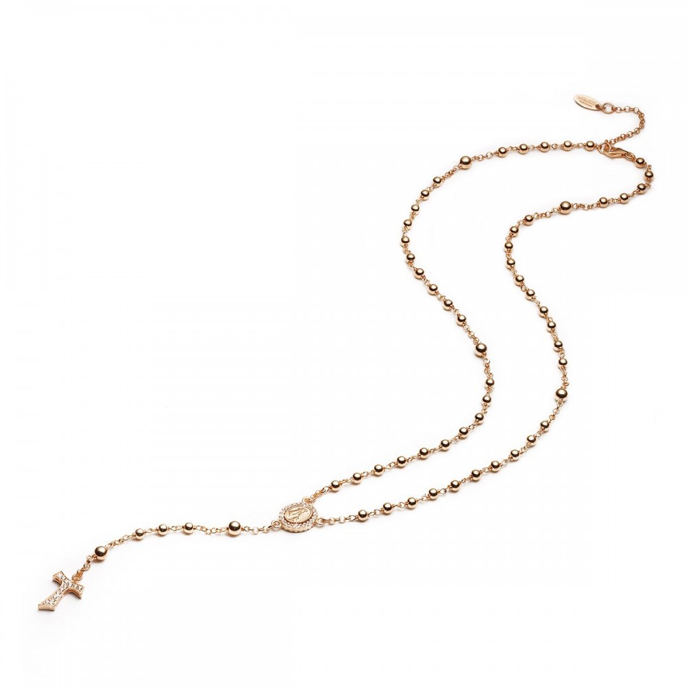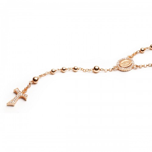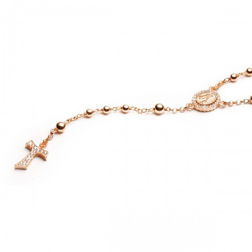 22kt rose gold plated 925 sterling silver ROSARY necklace, with double-sided medal depicting the Miraculous Virgin and Saint Francis with the wolf, Tau cross pendant.