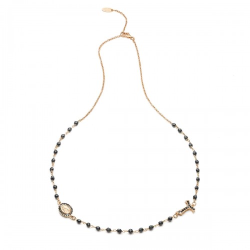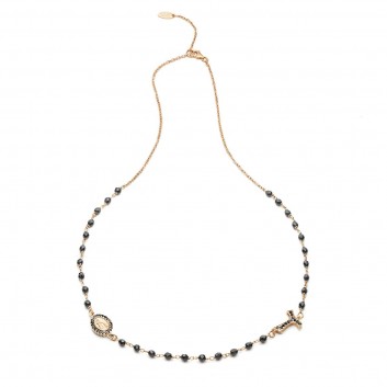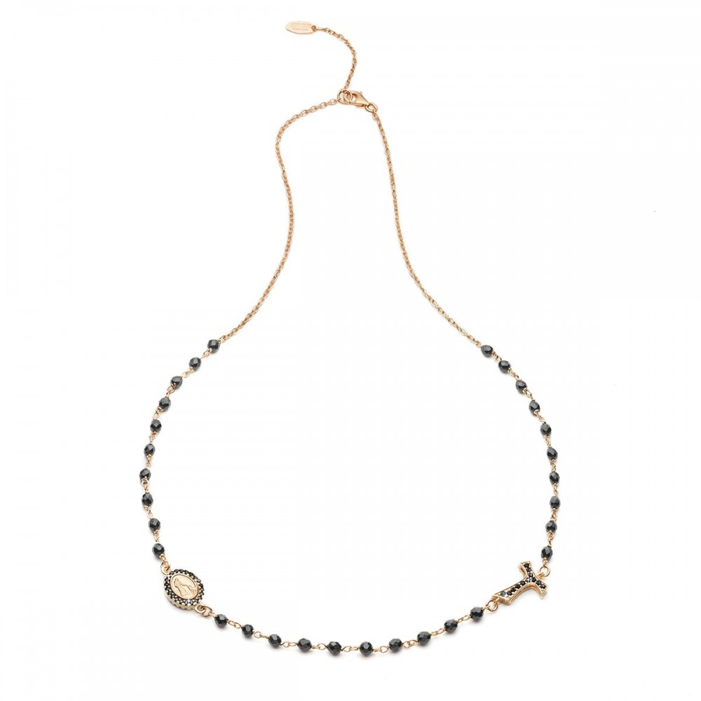 22kt rose gold plated 925 sterling silver ROSARY necklace, with faceted onix beads, double-sided medal depicting the Miraculous Virgin and Saint Francis with the wolf, Tau cross.