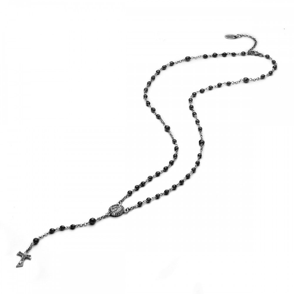 Burnished 925 sterling silver ROSARY necklace, with faceted onix beads, double-sided medal depicting the Miraculous Virgin and Saint Francis with the wolf, Tau cross. Medal and Tau cross with cubic zirconia pavè on both sides.