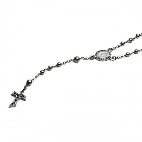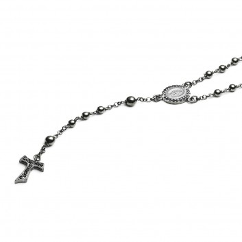 Burnished 925 sterling silver ROSARY necklace, with double-sided medal depicting the Miraculous Virgin and Saint Francis with the wolf, Tau cross pendant. Medal and Tau cross with cubic zirconia pavè on both sides.