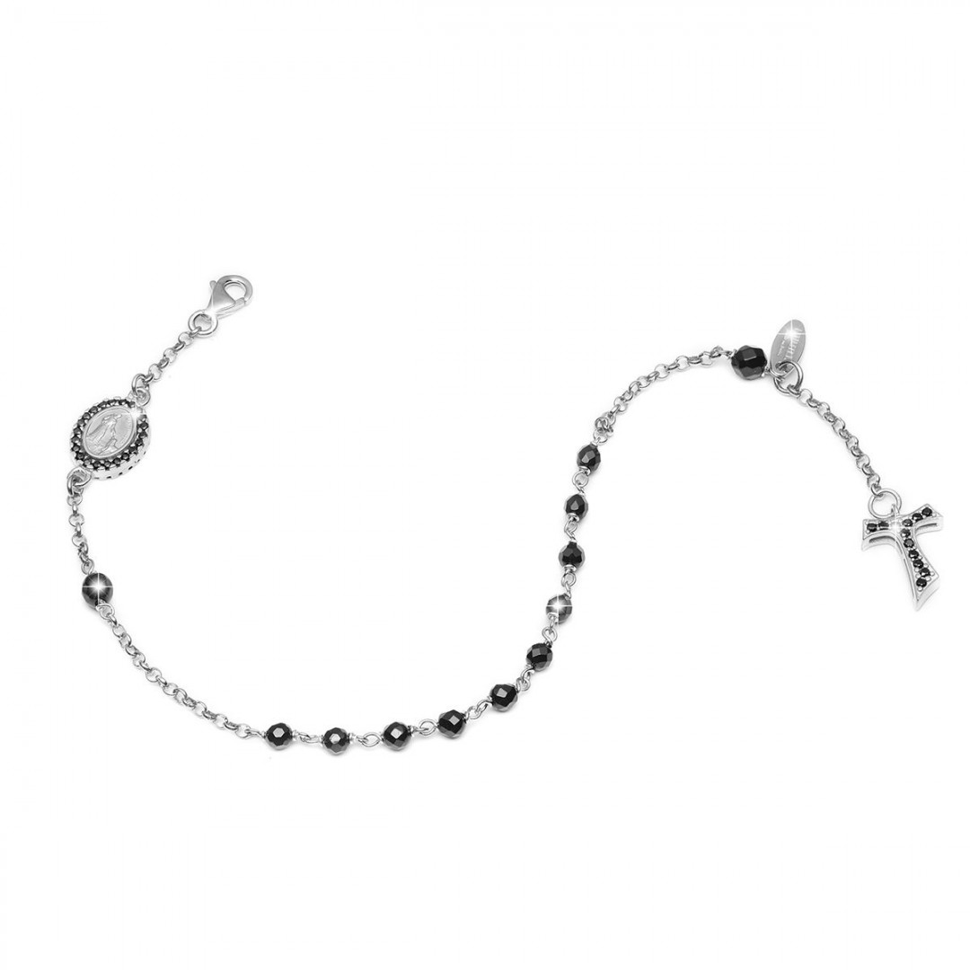 Rhodium plated 925 sterling silver ROSARY bracelet with faceted onix beads, with double-sided medal depicting the Miraculous Virgin and Saint Francis with the wolf, Tau cross pendant.