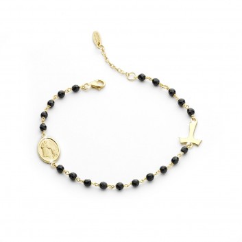 24kt yellow gold plated 925 sterling silver ROSARY bracelet with with faceted onix beads, Tau cross and double-sided medal depicting the Miraculous Virgin and Saint Francis with the wolf.
