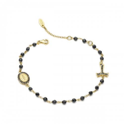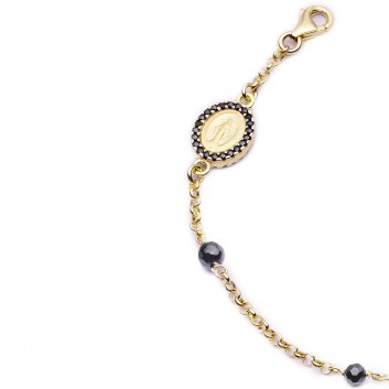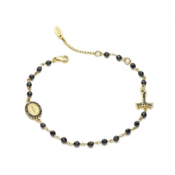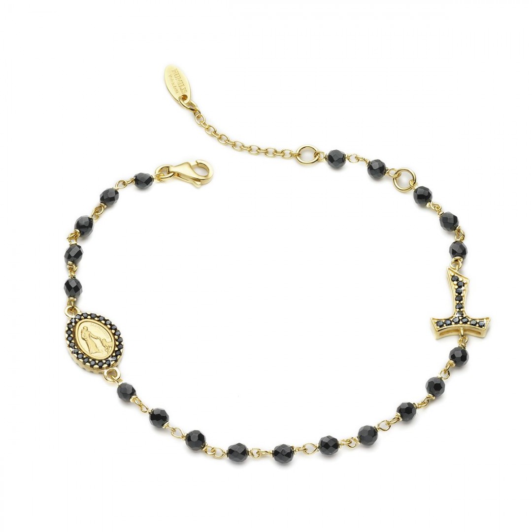 24kt yellow gold plated 925 sterling silver ROSARY bracelet, with faceted onix beads, Tau cross and double-sided medal depicting the Miraculous Virgin and Saint Francis with the wolf.