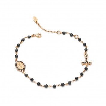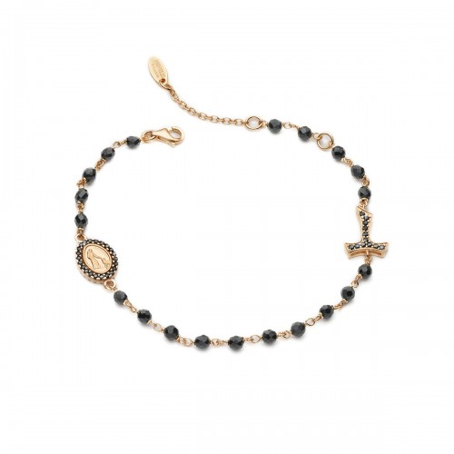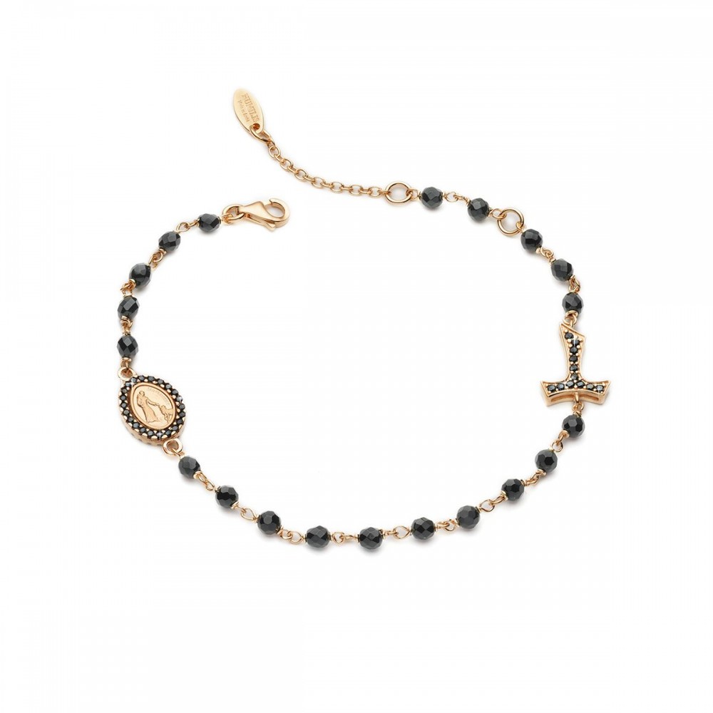 22kt rose gold plated 925 sterling silver ROSARY bracelet, with faceted onix beads, Tau cross and double-sided medal depicting the Miraculous Virgin and Saint Francis with the wolf.