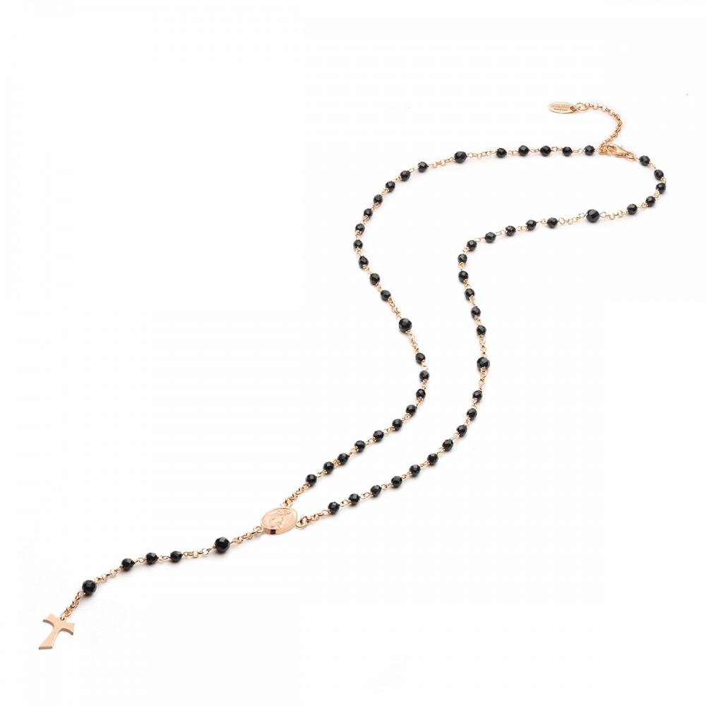 22 kt rose gold plated 925 sterling silver ROSARY necklace, with faceted onix beads, medal depicting Saint Francis with the wolf, Tau cross pendant.