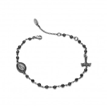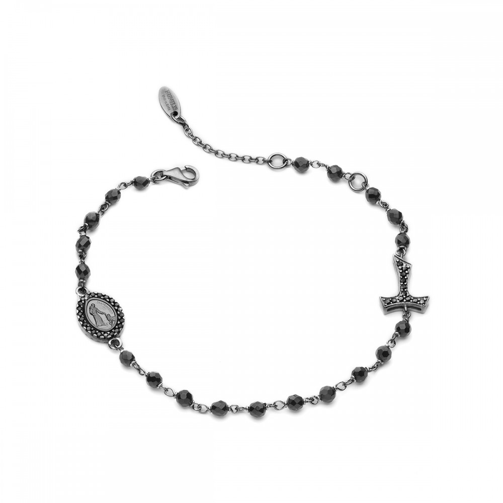 Burnished 925 sterling silver ROSARY bracelet, with faceted onix beads, Tau cross and double-sided medal depicting the Miraculous Virgin and Saint Francis with the wolf. Medal and Tau cross with cubic zirconia pavè on both sides.