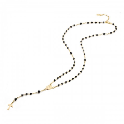 24kt yellow gold plated 925 sterling silver ROSARY necklace, with faceted onix beads, double-sided medal depicting the Miraculous Virgin and Saint Francis with the wolf, Tau cross. Medal and Tau cross with cubic zirconia pavè on both sides.