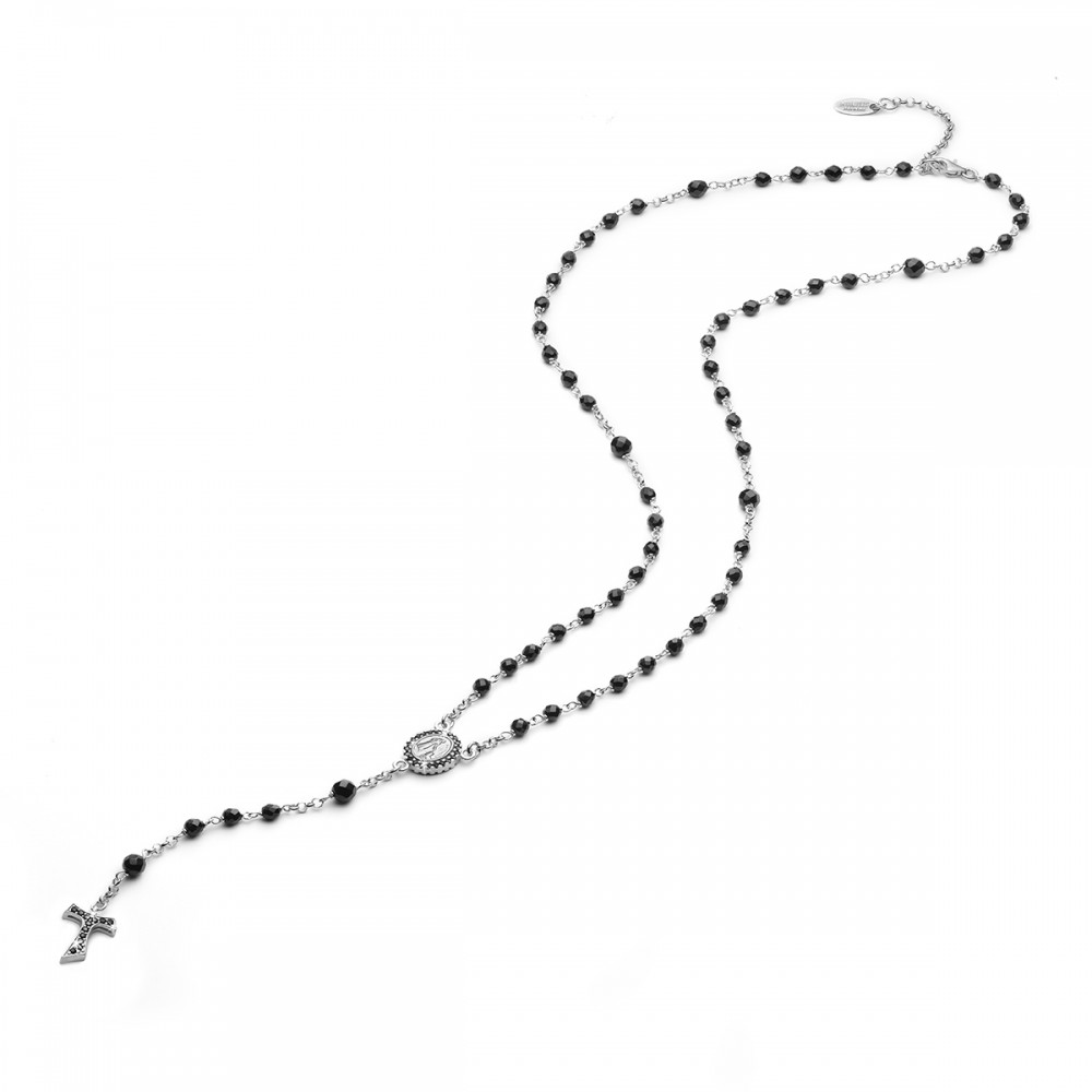 22kt rose gold plated 925 sterling silver ROSARY necklace, with faceted onix beads, double-sided medal depicting the Miraculous Virgin and Saint Francis with the wolf, Tau cross pendant. Medal and Tau cross with cubic zirconia pavè on both sides.