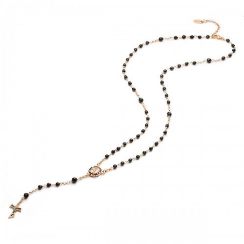 18 kt rose gold ROSARY necklace, with faceted onix beads, medal depicting Saint Francis with the wolf, Tau cross pendant.