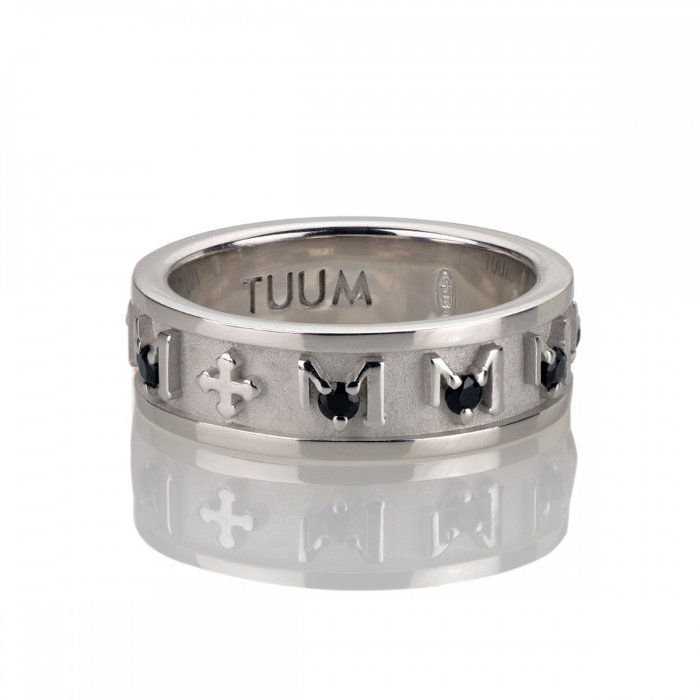 Rhodium plated 925 sterling silver TUAM ring with Hail Mary prayer in Latin language and black diamonds.