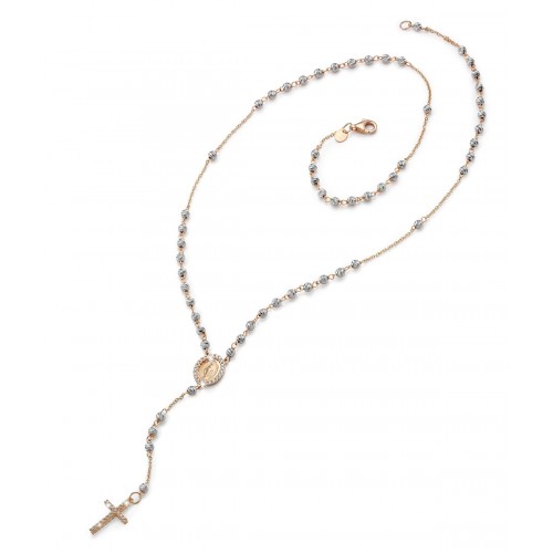 Collana rosario in oro bianco e rosa 18 Kt con grani diamantati, Madonna Miracolosa impreziosita da un pavè perimetrale di zirconi e croce con pavè di zirconi su entrambe i lati