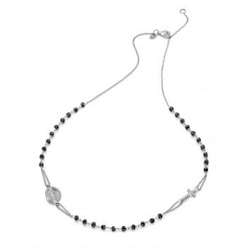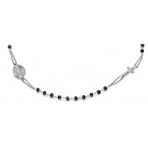 Collana rosario in oro bianco 18 Kt con grani in onice sfaccettato, Madonna Miracolosa impreziosita da un pavè perimetrale di zirconi e croce con pavè di zirconi su entrambe i lati