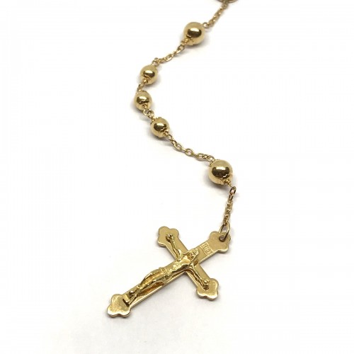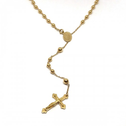 Collana rosario in oro giallo 18 Kt con grani lisci, medaglia della Madonna Miracolosa e croce con Cristo