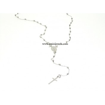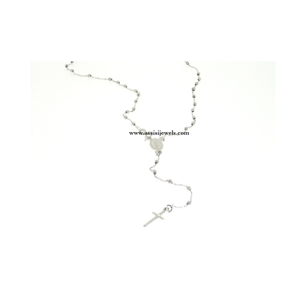 Collana ROSARIO in oro bianco 18 Kt con grani lisci, Madonna Miracolosa e croce liscia