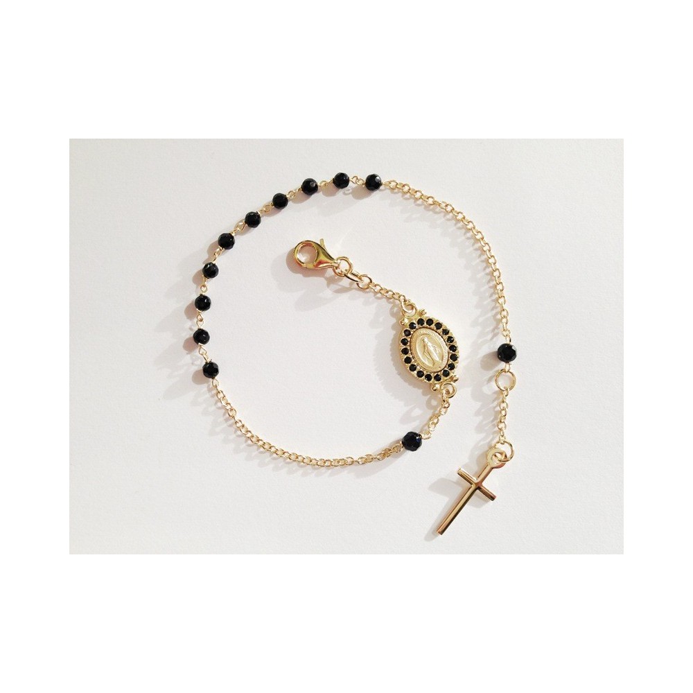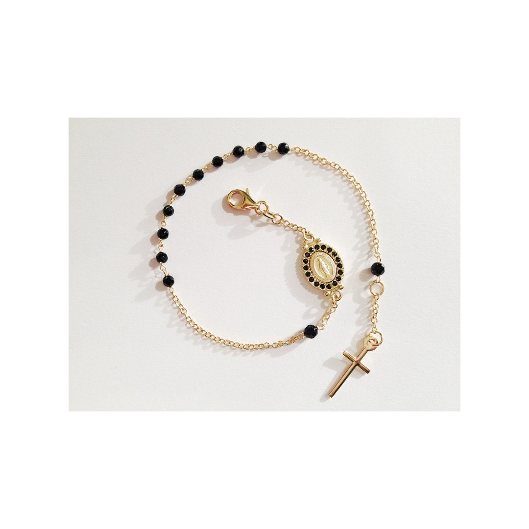 Bracciale ROSARIO in oro giallo 18 Kt con grani in onice nero sfaccettato, Madonna Miracolosa impreziosita da un pavè perimetrale di zirconi e croce finale liscia
