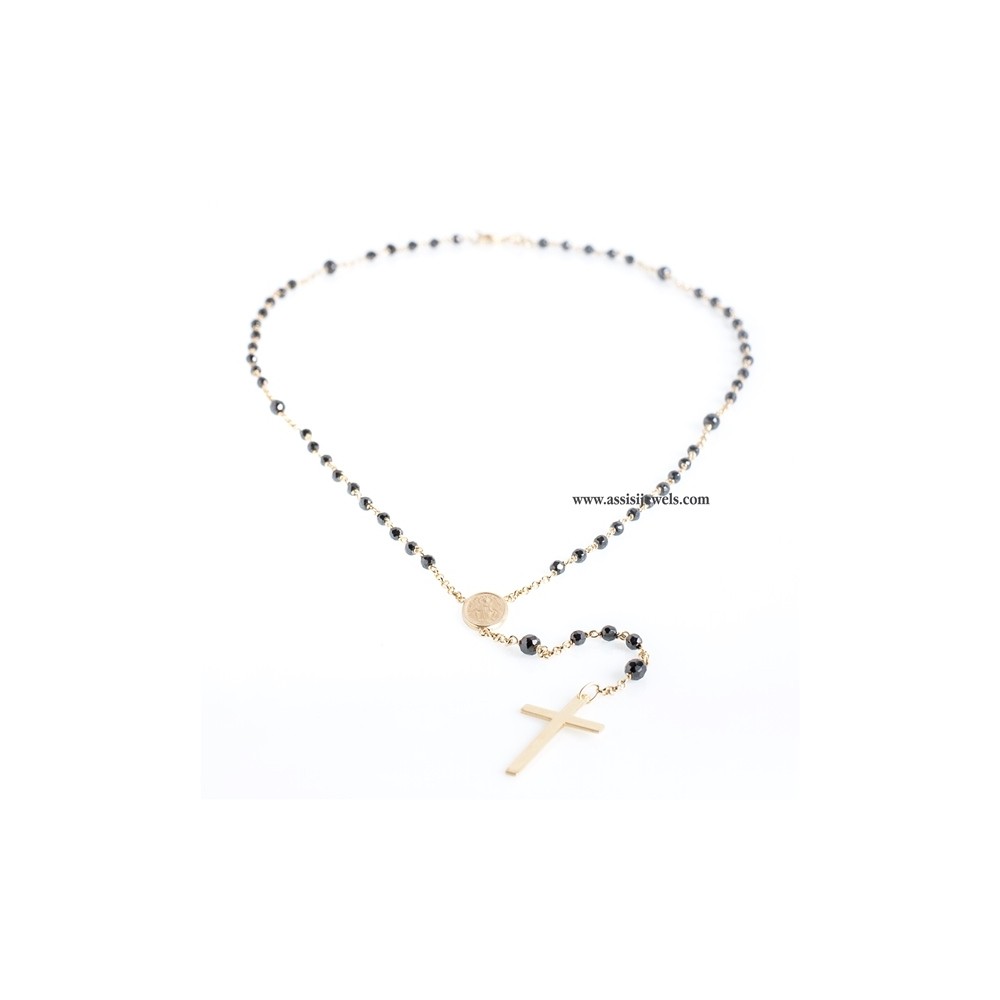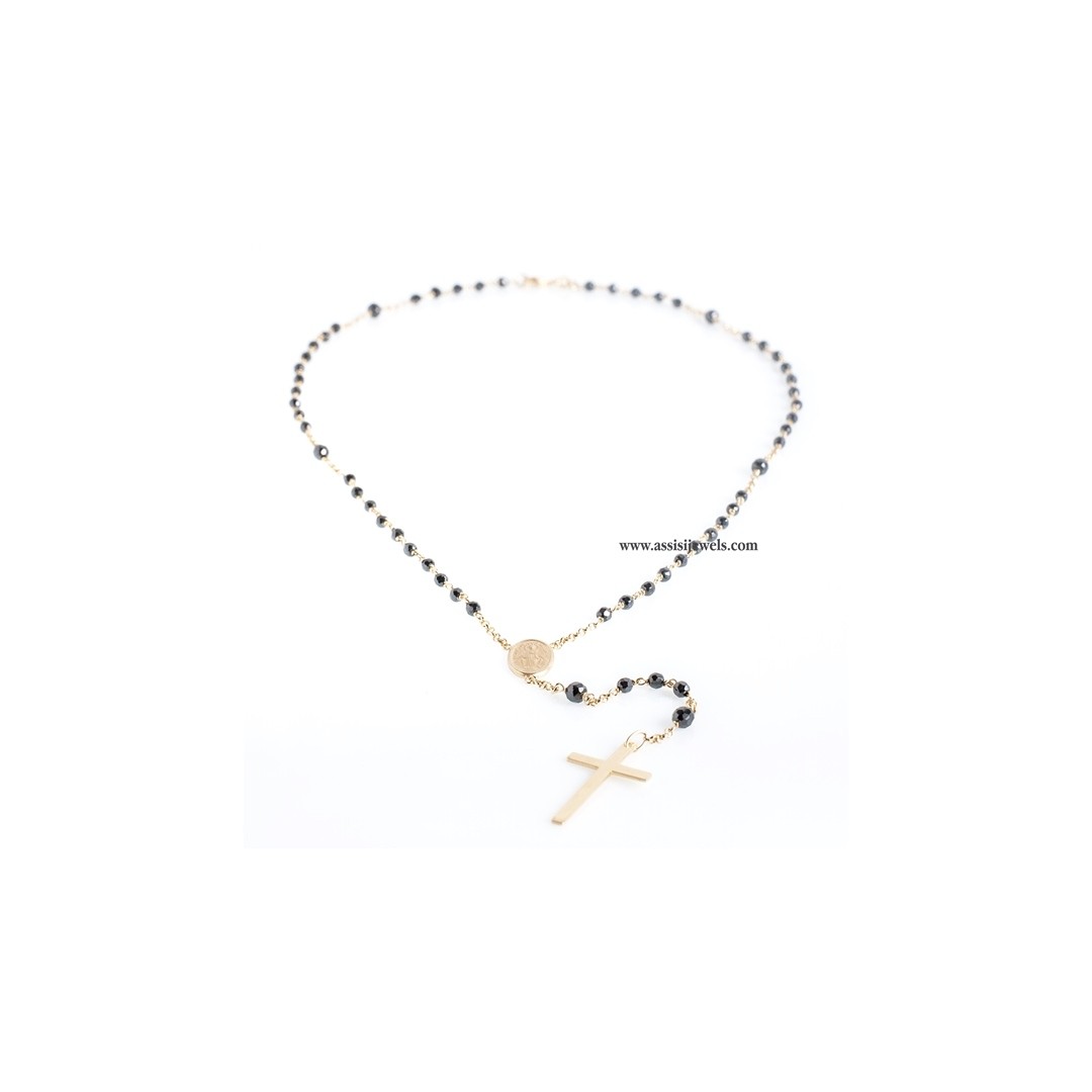 Collana ROSARIO in argento 925 placcato oro giallo 24 Kt con grani in onice sfaccettato, Madonna Miracolosa e croce finale