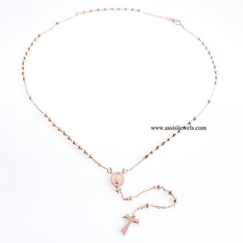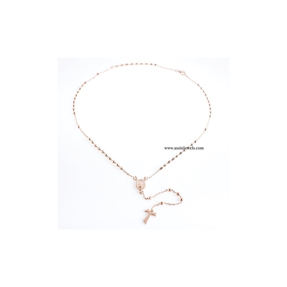 Collana ROSARIO in argento 925 placcato oro rosa 22 Kt con grani sfaccettati, medaglia della Madonna Miracolosa e croce Tau liscia