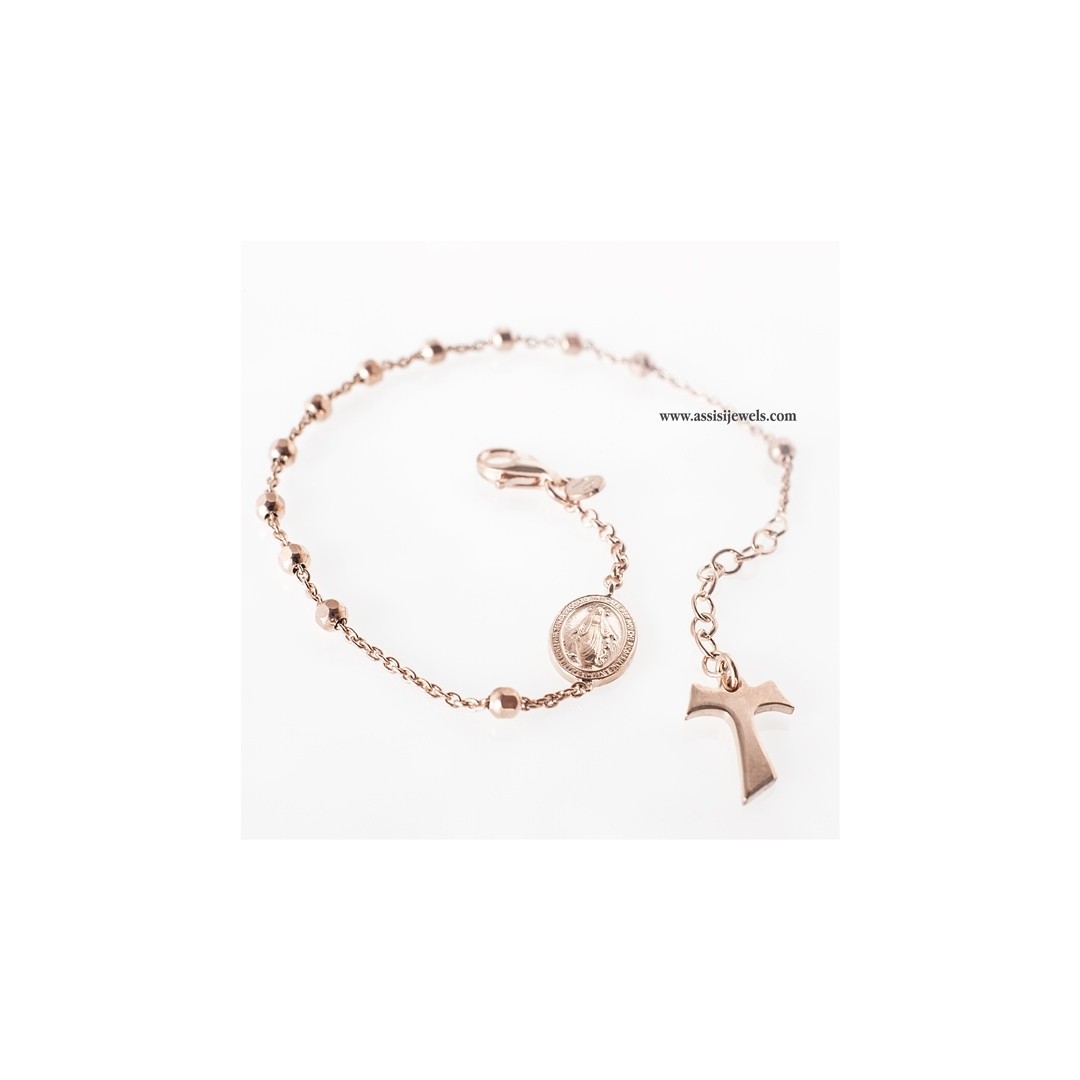 Bracciale ROSARIO in argento 925 placcato oro rosa 22 Kt con grani sfaccettati, medaglia della Madonna Miracolosa e croce Tau finale liscia