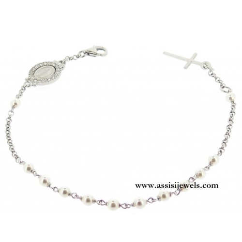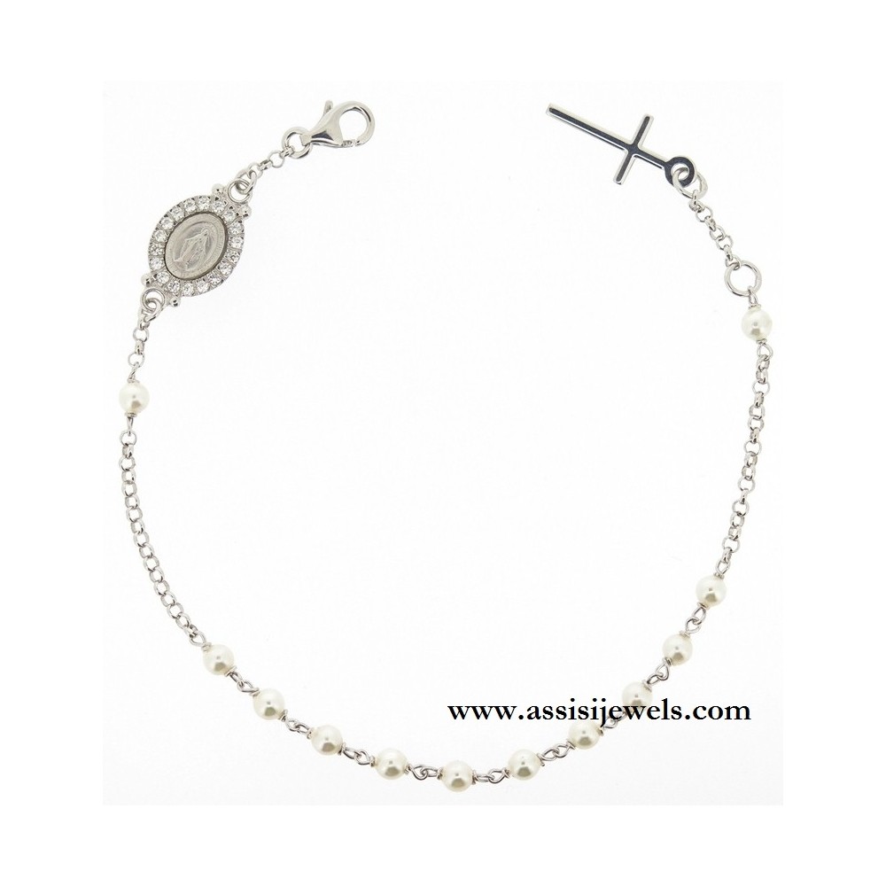 Bracciale ROSARIO in argento 925 rodiato con grani di perle bianche coltivate, Madonna Miracolosa impreziosita da un pavè perimetrale di zirconi e croce finale