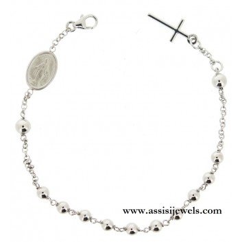 Bracciale ROSARIO in argento 925 rodiato con grani lisci, Madonna Miracolosa e croce finale.
