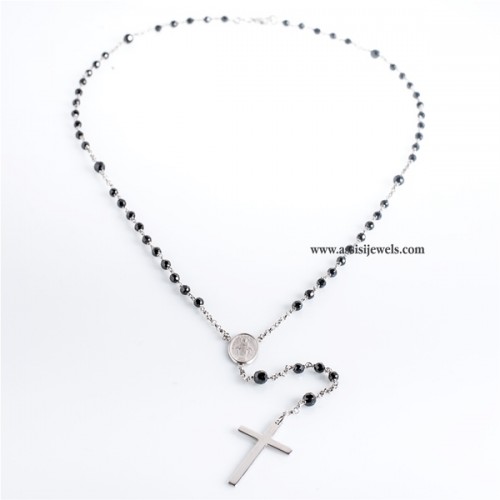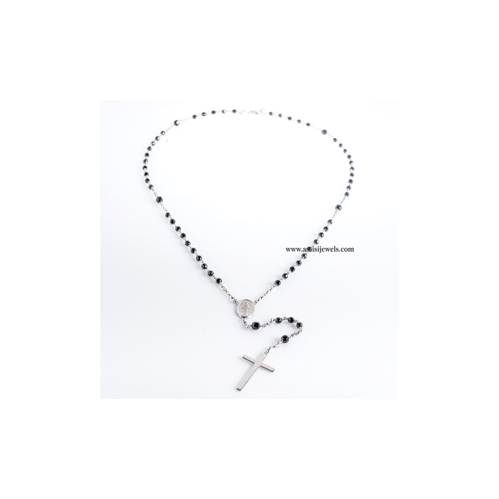 Collana ROSARIO in argento 925 rodiato con grani in onice sfaccettato, Madonna Miracolosa e croce finale
