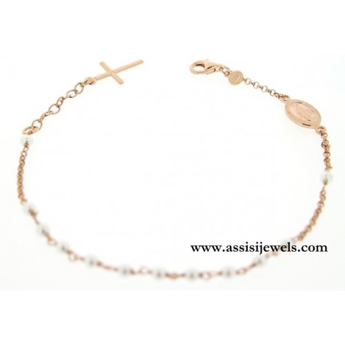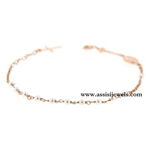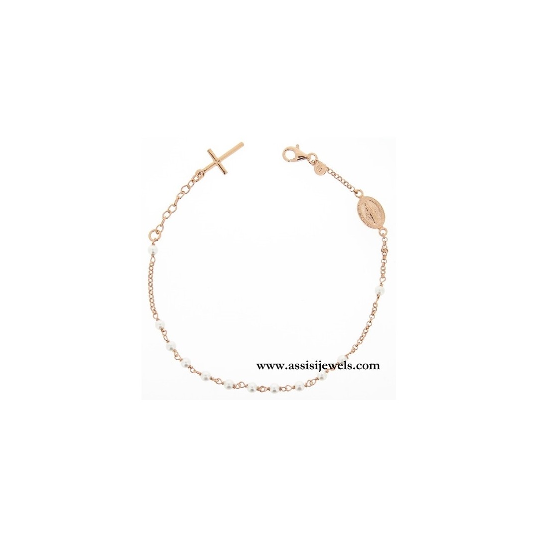 Bracciale ROSARIO in argento 925 placcato oro rosa 22 Kt con grani di perle, medaglia della Madonna Miracolosa e croce finale liscia