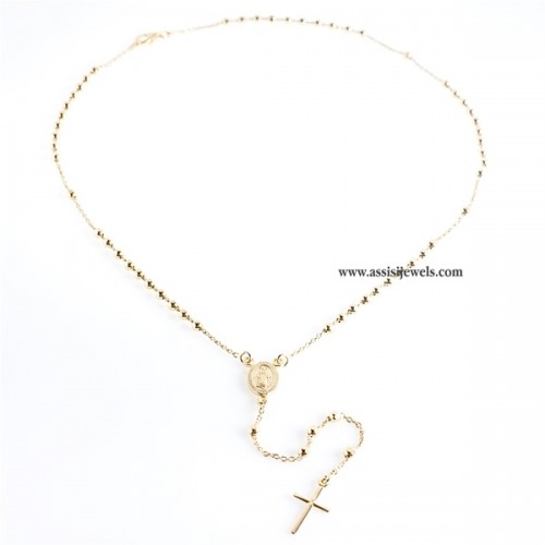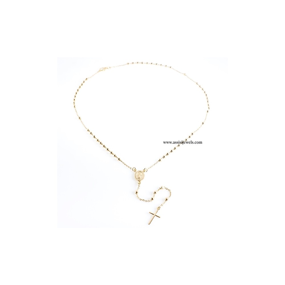 Collana ROSARIO in argento 925 placcato oro giallo 24 Kt con grani sfaccettati, medaglia della Madonna Miracolosa e croce finale liscia