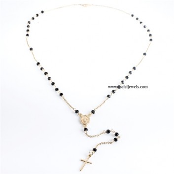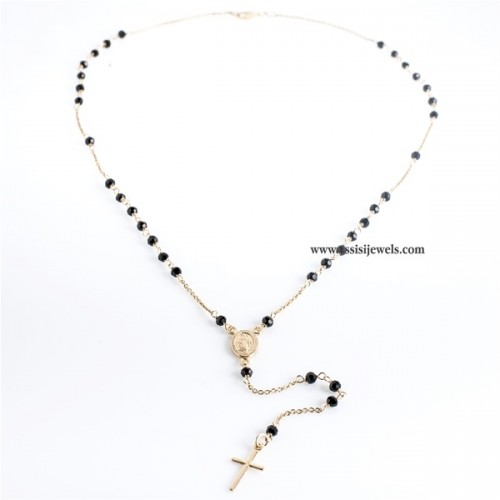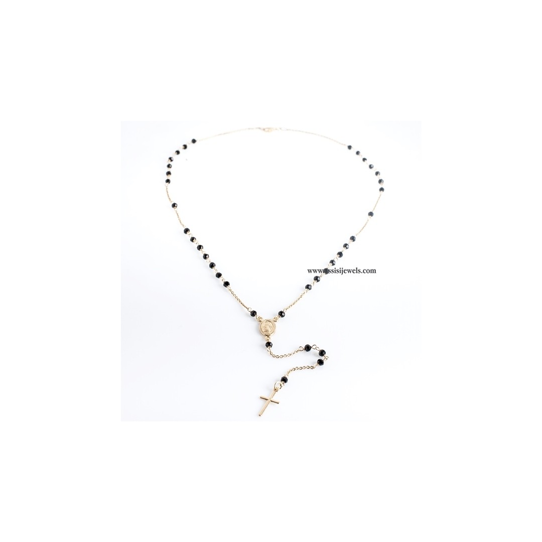 Collana ROSARIO in argento 925 placcato oro giallo 24 Kt con grani in onice sfaccettato, medaglia della Madonna Miracolosa e croce finale liscia