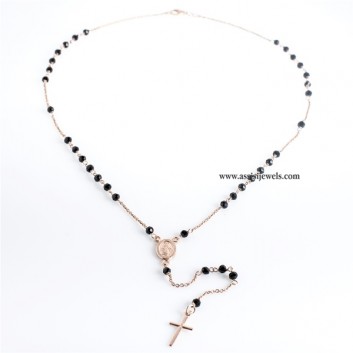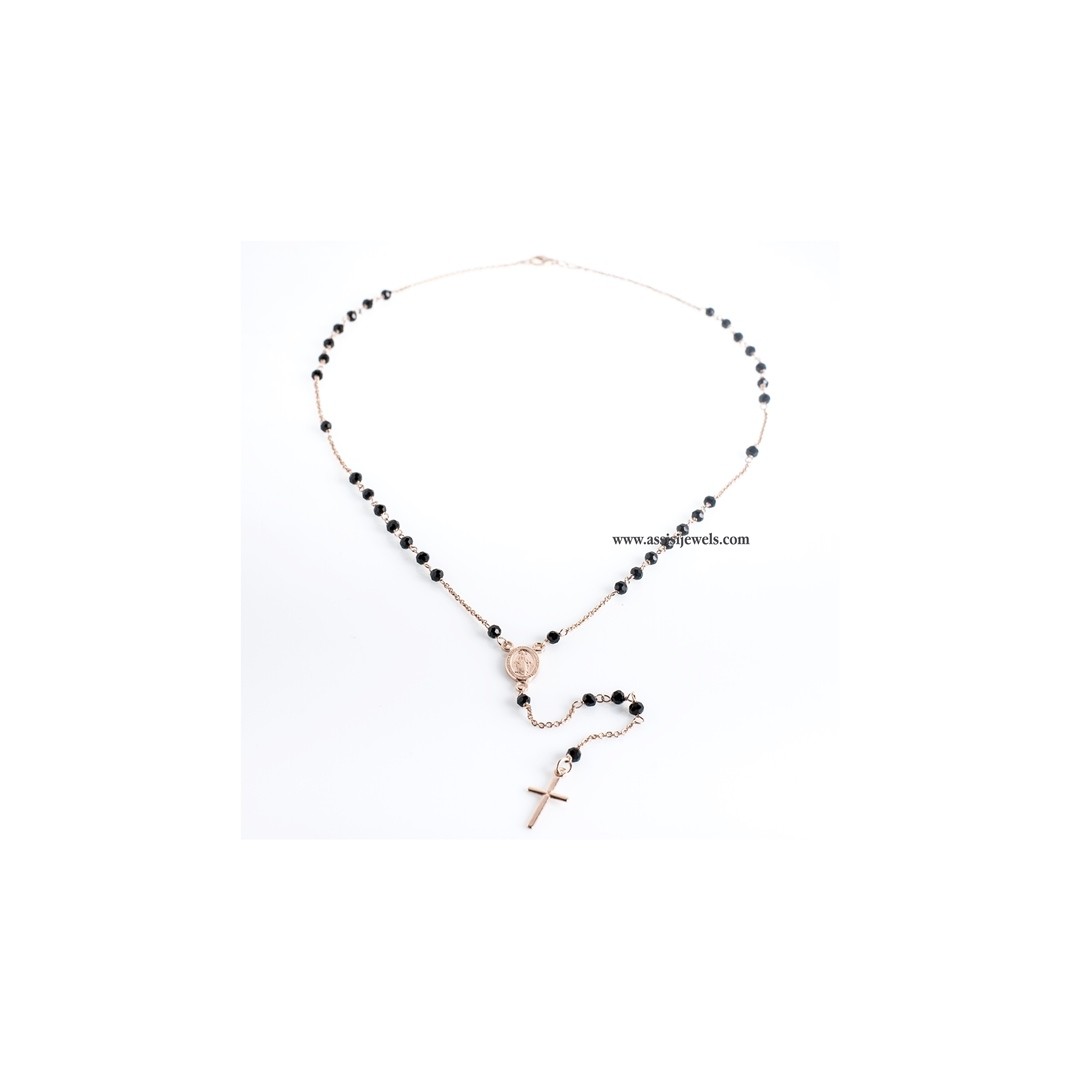 Collana ROSARIO in argento 925 placcato oro rosa 22 Kt con grani in onice sfaccettato, medaglia della Madonna Miracolosa e croce finale liscia