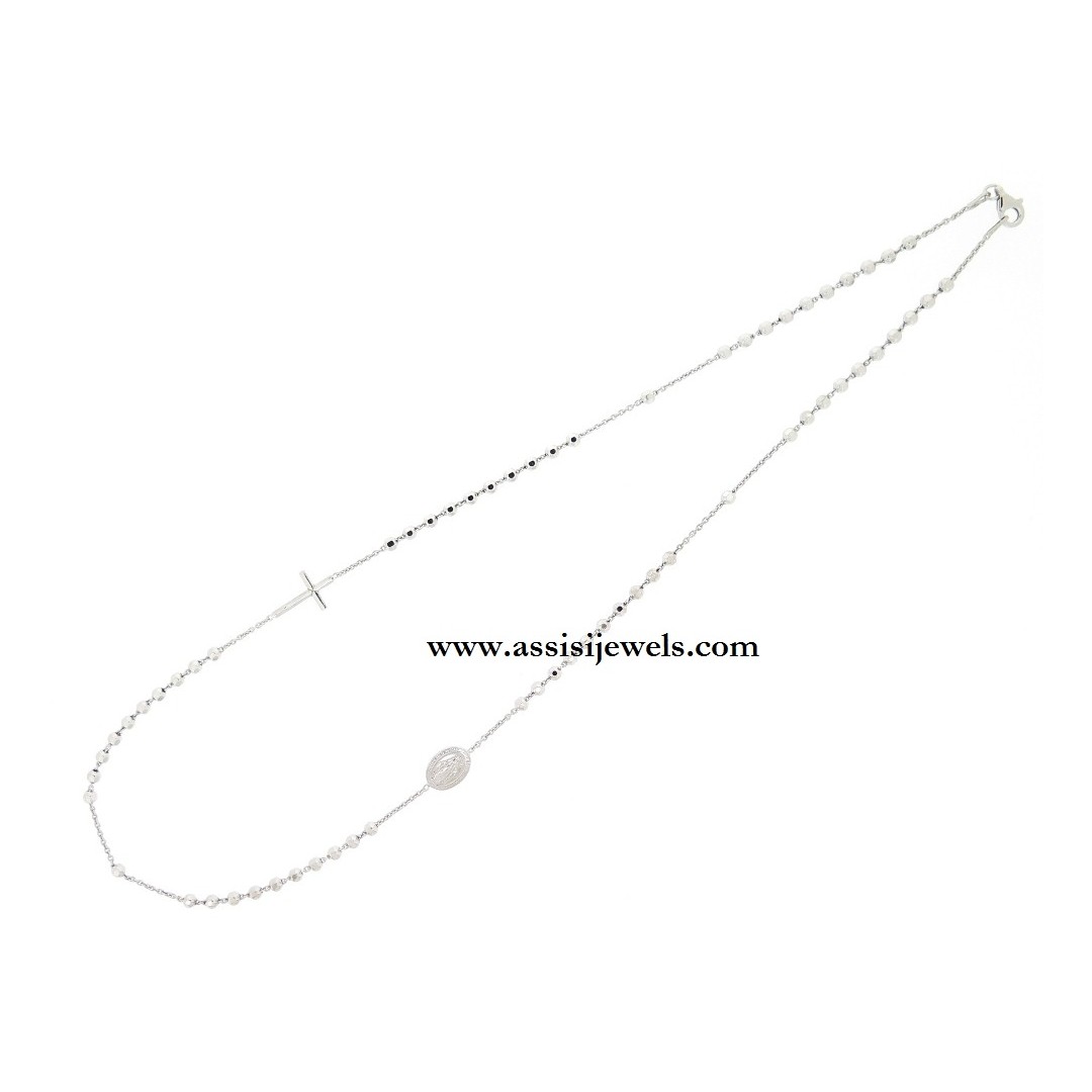 Collana ROSARIO in argento 925 rodiato con grani sfaccettati, medaglia della Madonna Miracolosa e croce  liscia