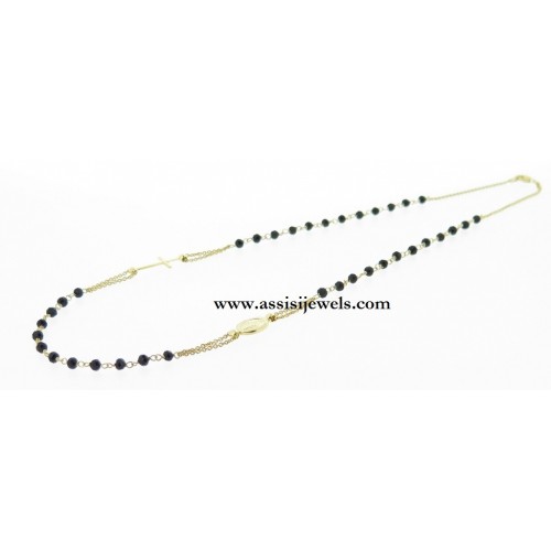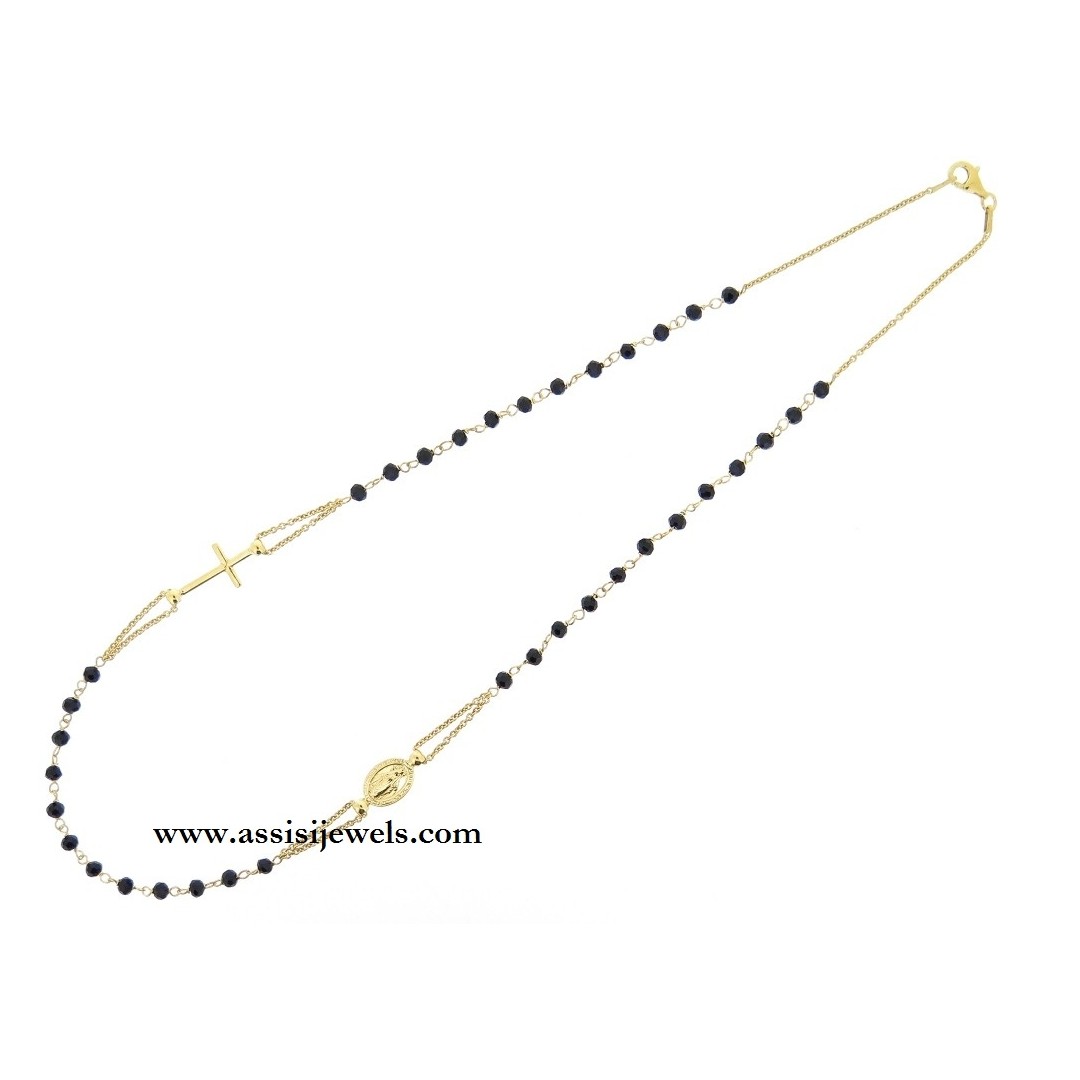Collana ROSARIO in argento 925 placcato oro giallo 24 Kt con grani in onice sfaccettato, medaglia della Madonna Miracolosa e croce finale liscia
